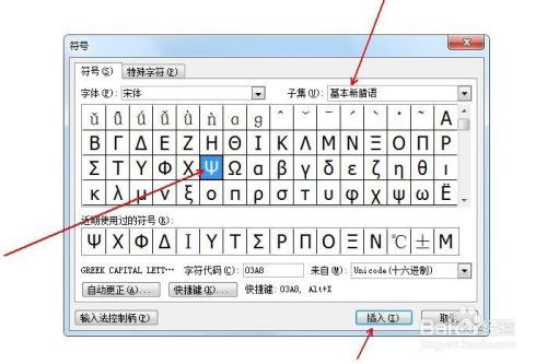 在“子集”中选择“根基希腊语”,并鄙人方选中年夜写希腊字母普西Ψ,点击“插入”。