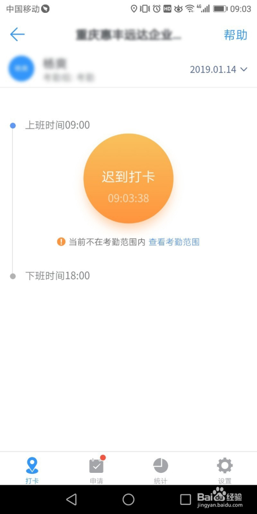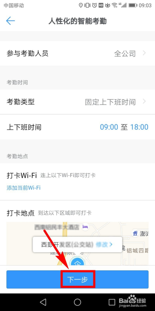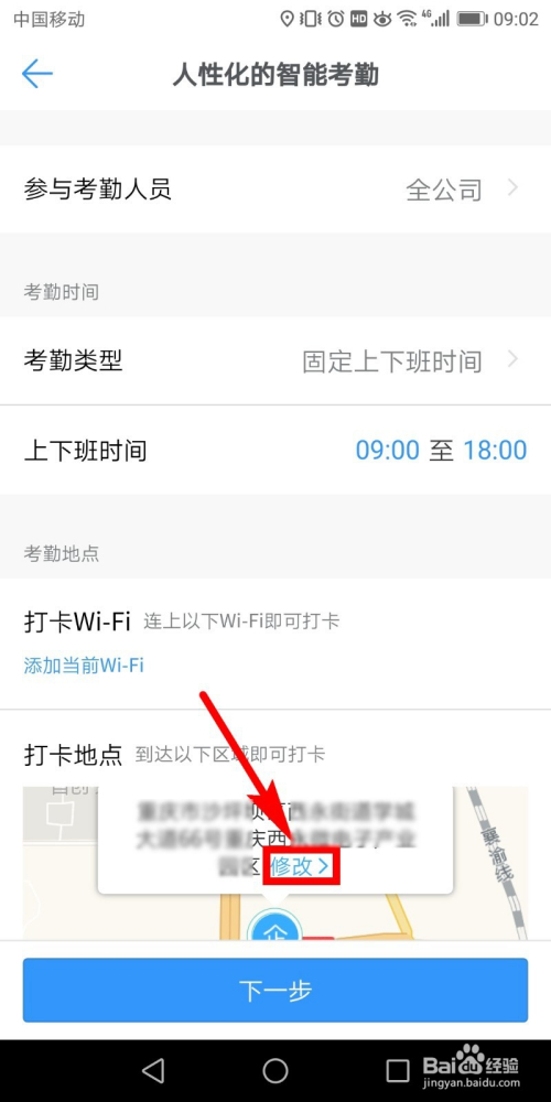 点击考勤今后,就是考勤设置页面了,在页面中设置考勤人员的规模、时候等信息,若是位置禁绝确,则点击图示下方地图定位上的【点窜】。