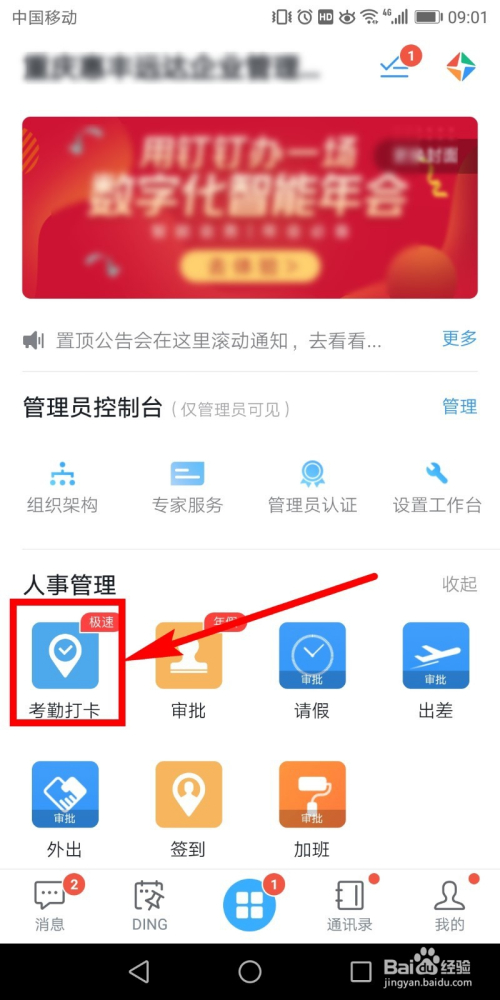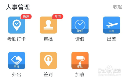 然后便能看到工作页面了,在工作页面点击图示位置的【考勤】。