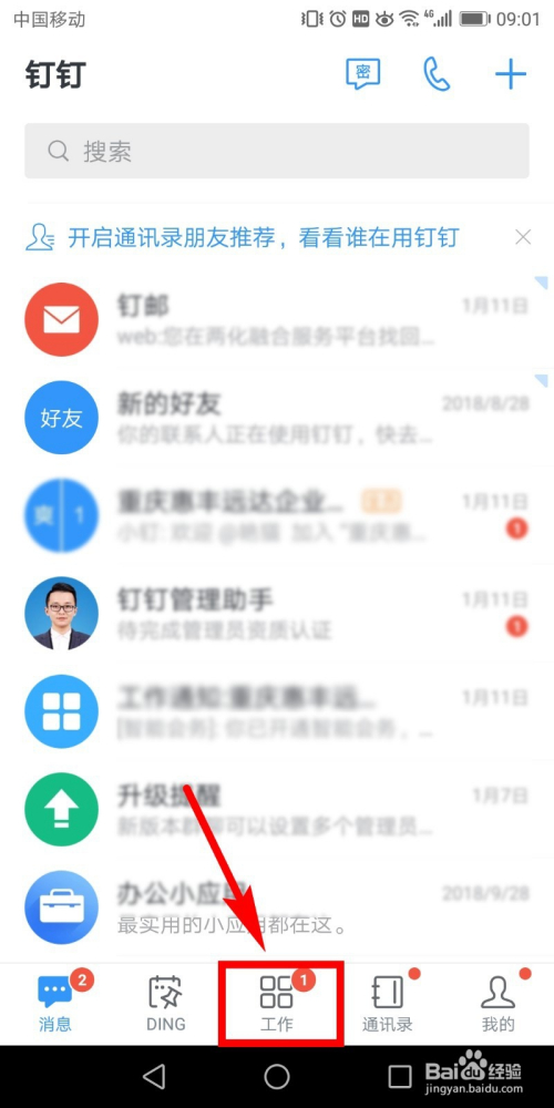 首先进入到钉钉的首页,在首页下方图示位置点击【工作】菜单。