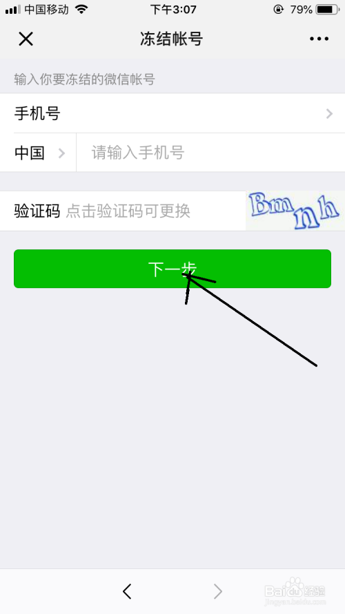 打开冻结帐号界面中输入要冻结的微信帐号,输入完当作后点击下一步按钮。