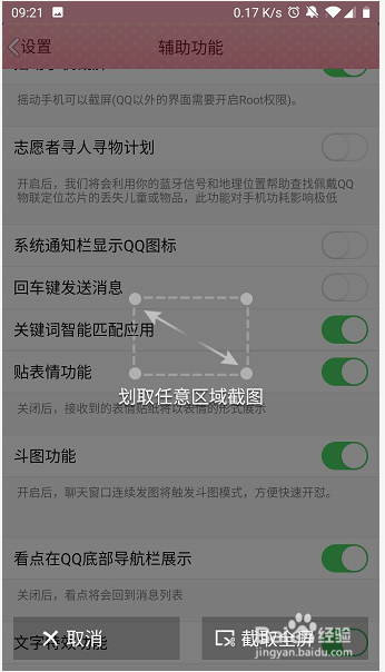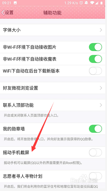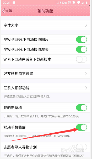 在辅助功能中,我们可以找到摇脱手机截屏功能,这个功能可以让我们快速在QQ上怎么截屏,同时也可以帮忙其他的软件进行截图,可是需要root