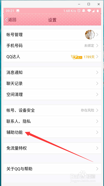 在设置功能中我们可以找到辅助功能,然后点击辅助功能我们就可以设置一些QQ的辅助功能设置。