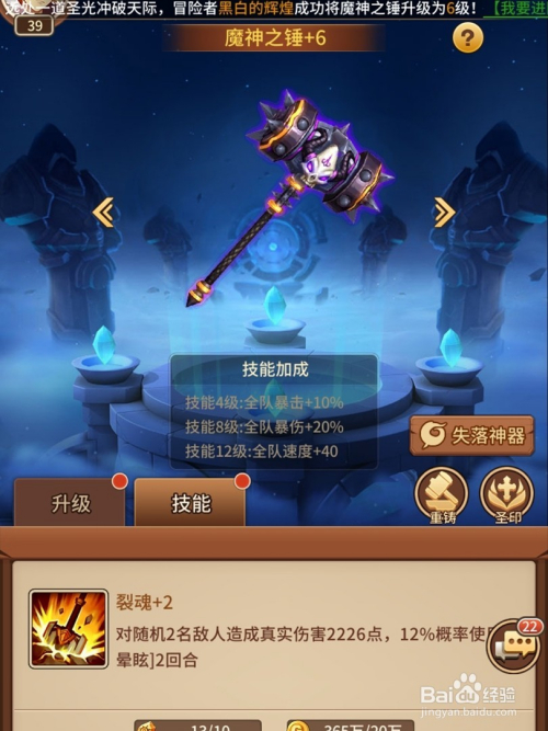 完当作神器使命获得所有神器之后就可以解锁神器进级技术了。