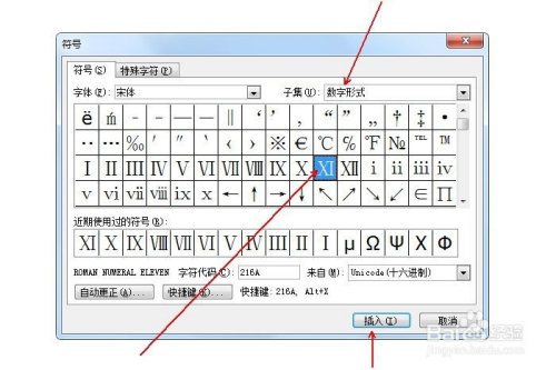 在“子集”中选择“数字形式”,并鄙人方选中年夜写罗马数字11(Ⅺ),点击“插入”。