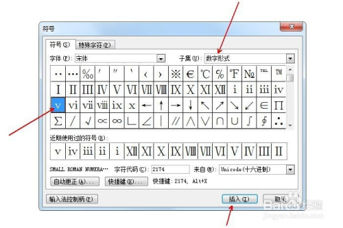在“子集”中选择“数字形式”,并鄙人方选中小写罗马数字5(ⅴ),点击“插入”。