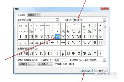 在“子集”中选择“数字形式”,并鄙人方选中年夜写罗马数字8(Ⅷ),点击“插入”。