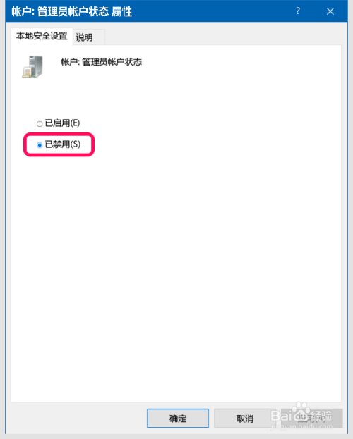 回到 帐户:办理员帐户状况 属性 - 当地平安设置 窗口中,点击:已启用;