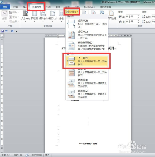 为了顺遂从后面一页起头编码,我们要插入分节符。首先把鼠标放在首页的最后文字的末从头至尾,好比这里放置在“xxx年夜学研究生院制”的最后面。然后依次点击:页面结构-分隔符-下一页。