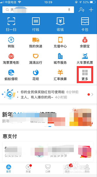 打开手机,在屏幕上找到【付出宝】APP,点击登录进入APP首页。在首页上找到应用调集后边的【更多】图标(如图所示),点击【更多】!