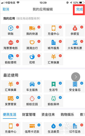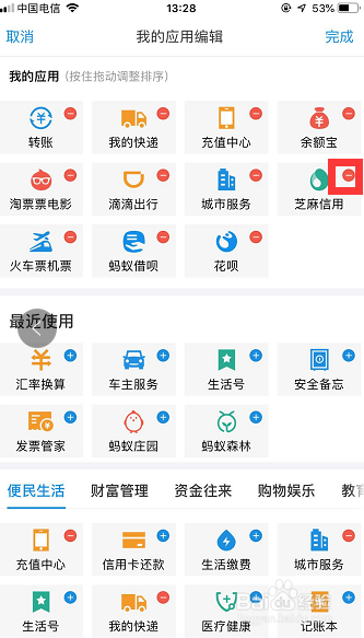 点击【编纂】后,进入【我的应用编纂】本家儿页。因为付出宝首页只能放11个应用(我的应用栏下的那11个),要添加1个新的就只能删失落1个本来的。以【芝麻信用】为例,点击该应用右上角的红色减号图标进行删除,如图所示!