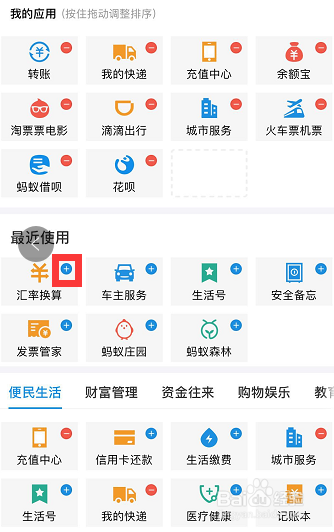删失落【芝麻信用】后,首页的应用就空出来了一个,此时想添加哪一个,就点击哪一个应用右上角的蓝色加号图标,下图以添加【汇率换算】为例!