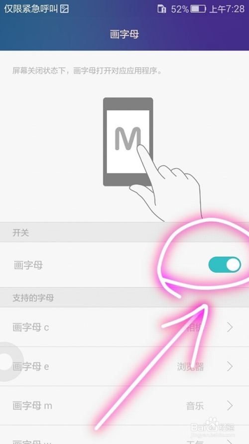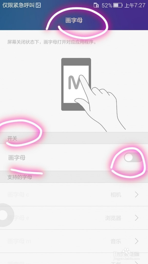 这时可以看到我们手机所撑持的字母和响应的手机应用,当手机处于黑屏状况时画该字母就会打开响应的手机应用。