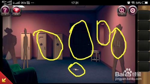 后台的场景如下图所示,可以点击的场景有左侧星星柜,中心的木门,右侧展示框。我们捡起地上的木头碎片,右侧牛仔身上有个4,牛仔的印象就是手枪,所以说4对应着手枪。
