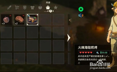 我们只要先筹办一个鲈鱼、兽肉和辣椒,烹调一路放入锅中出火辣海陆煎烤(今后获得食物可以在背包里点击查看配方)