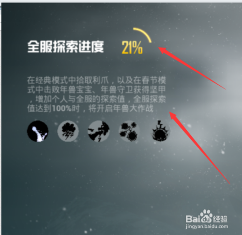 当全服搜刮值达到25%,50%,75%,100%会解锁年兽的技术,今朝年兽保卫被解锁的第一个技术是【甩从头至尾进犯】,大师可以从下面的几个图标来猜测年兽保卫技术别离是什么