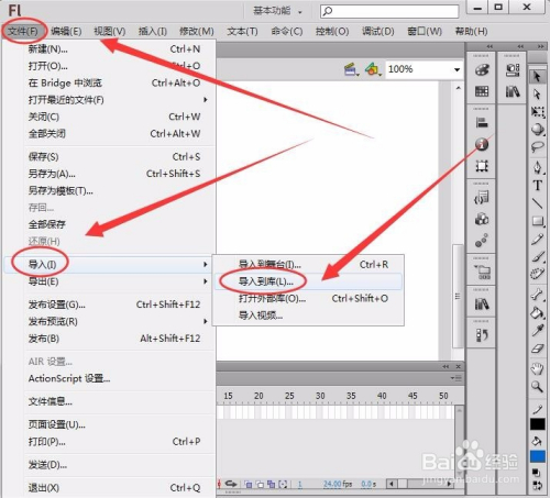 Flash窗口中,单击文件---->导入---->导入到库,导入一张布景图片。