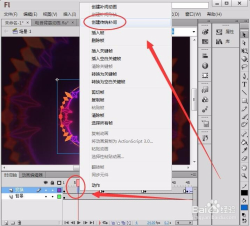 在时候轴的第1帧与第15帧之间右击,选择建立传统补间选项,添加补间动画。