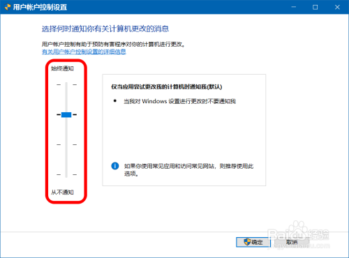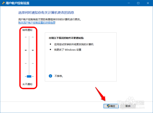 若是需要封闭你要许可此应用对你的设备进行更改吗 的弹窗,则可以将【滑块】移动到第一档,再点击:确定,此时再安装软件就不会再弹出 你要许可此应用对你的设备进行更改吗 的弹窗了。