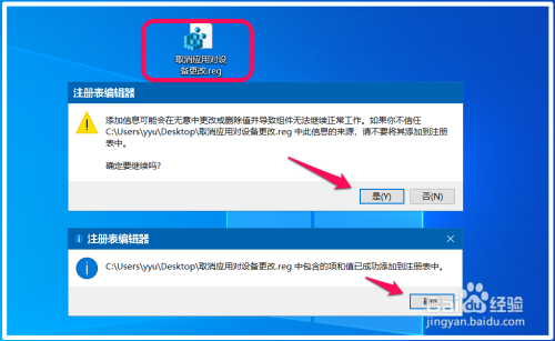 我们在系统桌面上找到并左键双击【打消应用对设备更改.reg】注册表文件图标,在先后弹出的注册表编纂器对话框中点击:是(Y)和确定。