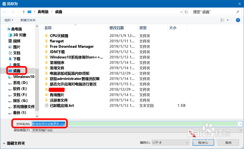 在另存为窗口中,先点击窗口左侧的【桌面】,在文件名(N)栏中输入:打消应用对设备更改.reg(或其他名称),再点击:保留;