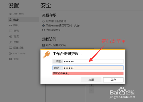 一旦勾选了许可无监视的拜候复选框,立马会弹出工作台密码更改的画面,设置 密码即可。这里密码会检测复杂度,不敷平安的密码不克不及被保留。