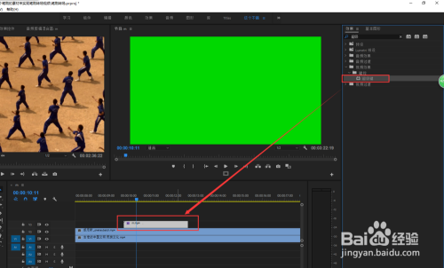 在窗口菜单中勾选显示结果窗口,在结果的搜刮栏中搜刮获得“超等键”的视频结果。并拖到笔刷视频素材上。