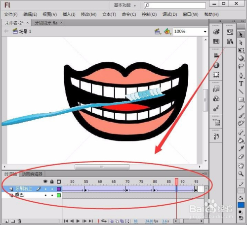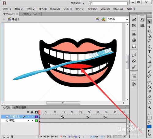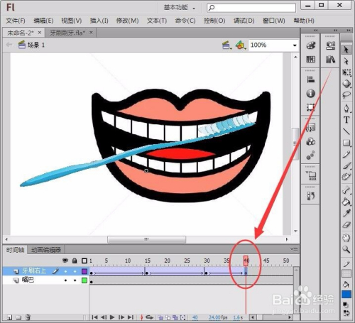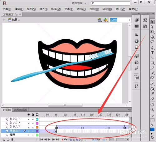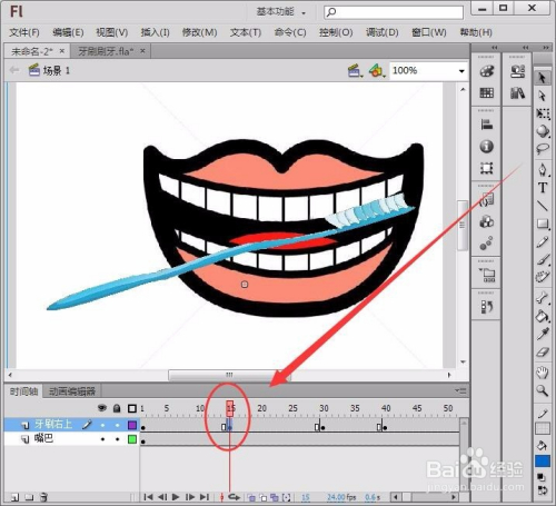 图层的第15帧处插入一个关头帧,将牙刷元件移到上排牙齿的下端。