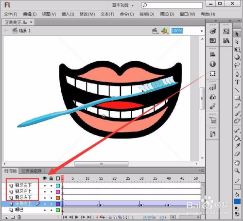 然后,建立3个图层,别离实现刷牙齿的右下、牙齿的左上和牙齿的左下动画。