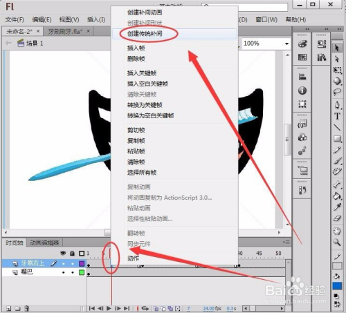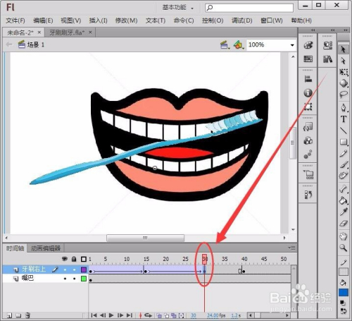 30帧处插入一个关头帧,将牙刷元件移回牙齿上部,并建立传统补间动画。