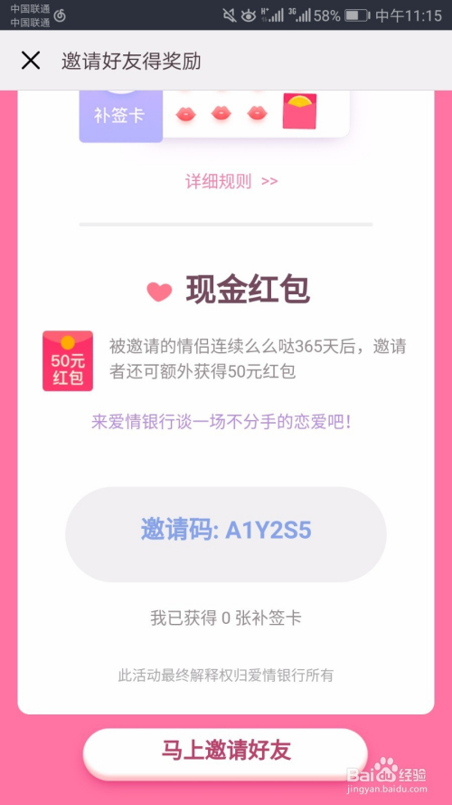 4.同时邀请老友而且老友当作功与他的对象当作为情侣起头么么哒,当你在持续么么哒365天后还可以额外获得50元现金奖励,同时还会送你一张补签卡,防止在365天中你健忘签到而前功尽弃。