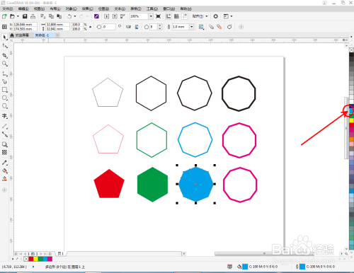 选中彩色线框的几个多边形图案,点击鼠标右键拉动复制出别的几个多边形图案。点击五边形图案,鼠标左键点击右边色板中的红色色块,将五边形填充为红色。按照同样的步调,完当作其他多边形的建造(如图所示);
