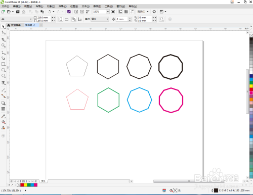 打开CorelDRAW X8软件,点击【多边形东西】,设置很多多少边形的边数和线广大小后,在作图区域别离绘制出五边形、六边形、八边形以及十边形(如图所示);