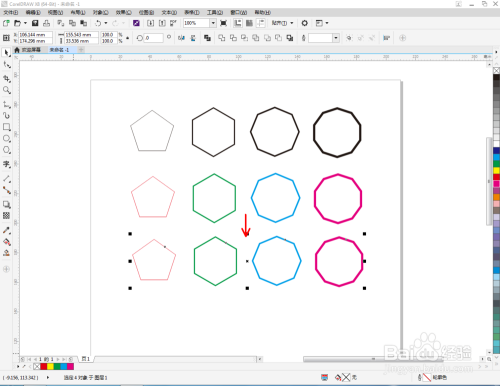 选中所有多变形图案,点击鼠标右键拉动复制出多边形图案副本。选中五边形,鼠标右键点击右边色板中的红色,完当作线框颜色的设置。按照同样的步调,完当作其他多边形的设置(如图所示);