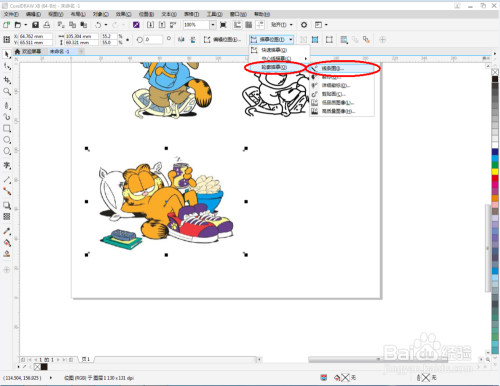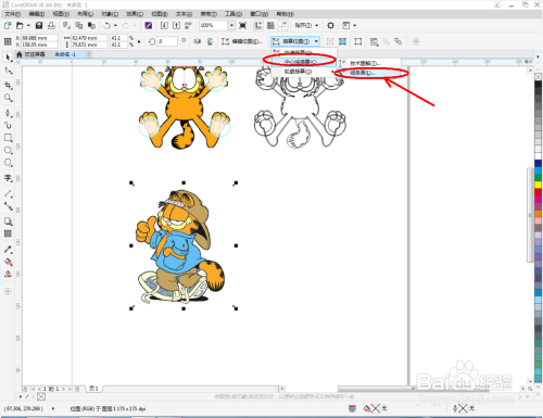 将第二个卡通图案拉进作图区域,点击【描摹位图】-【中间线描摹】-【线条画】,并按图示进行设置。完当作后,将获得的新图案拉动到右边,将上方描边大小设置为0.75后,鼠标左键点击右边色板中的×块(如图所示);