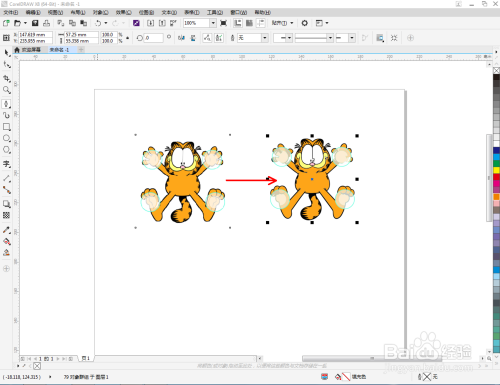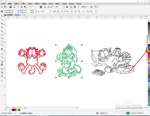 选中第一个描摹出来的图案,鼠标右键点击右边色板中的红色,将其设置为红色。按照同样的步调设置好别的两个图案的颜色即可(如图所示)。