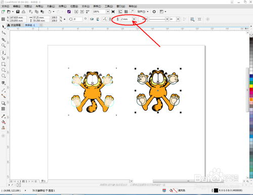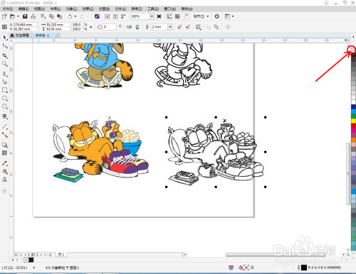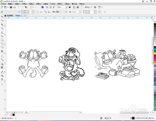 将第三个卡通图案拉进作图区域,点击【描摹位图】-【轮廓描摹】-【线条画】,并按图示进行设置。完当作后,将获得的新图案拉动到右边,将上方描边大小设置为0.2后,鼠标左键点击右边色板中的×块(如图所示);