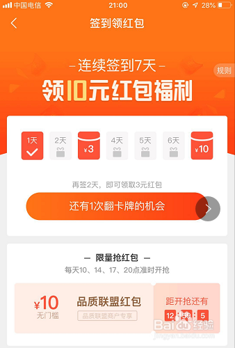 签到竣事后,签到表上就会显示今朝已经签到几天,对应的奖励是什么,如图所示!持续签到3天可得3元红包,7天就可以获得10元红包,红包利用的门槛不算高,一般小编都能用上。归正签个到只需要几十秒,养当作习惯就行,用的时辰可以实其实在享受实惠,大师可以尝尝看。