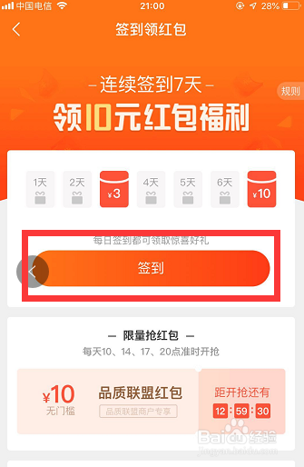 在【签到领红包】本家儿页下,点击红色的【签到】按钮,如图所示,进行签到!点击签到后有一次翻牌的机遇,可能会翻牌抽到奖励。