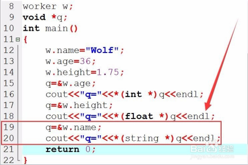 先让指针变量指标的目的整型变量age的地址,输出变量值时需用int*强制转换指针类型。