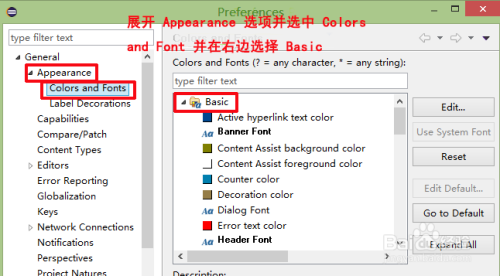 Colors and Fonts。再选择右侧选项中的Basic选项。