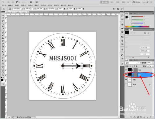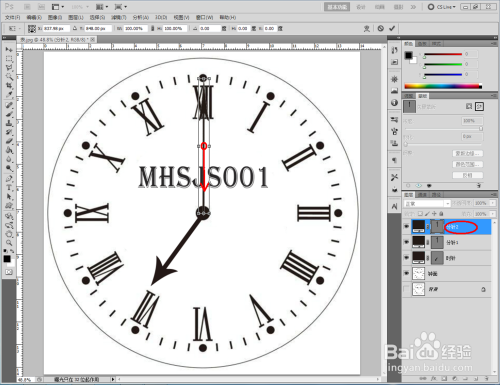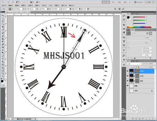 选中时针图层,按下键盘【Ctrl】+【T】键,将扭转点移动至时钟中间点并进行扭转至指定位置。选平分针图层,按照同样的步调将指针扭转到指定位置(如图所示);