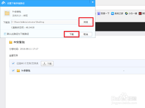 之后会弹出下载界面,下载地址可以点击“浏览”后进行选择(小编建议不选择C盘),完当作后点击“下载”。(这里小编要说一点,没有安装百度云管家也是可以下载的,只不外速度比力慢)