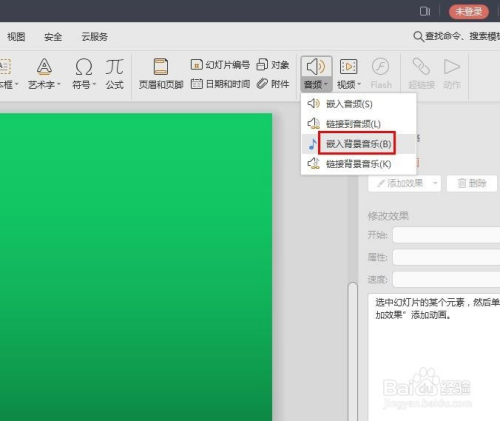 第三步:单击“音频”后边黑色小三角,鄙人拉菜单中选择“嵌入布景音乐”。