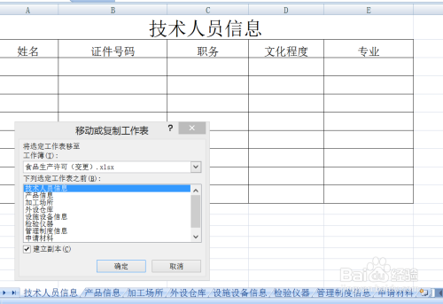 在“移动或复制工作表”下,选择第一个sheet表,如“手艺人员”sheet;勾选“成立副本”。点击“确定”。即可显示复制后的方针sheet表,改名为“目次”