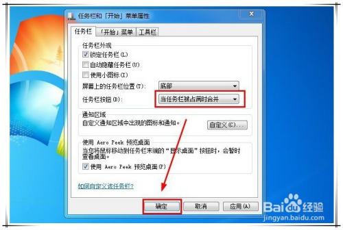 第五步,返回到“使命栏”属性窗口,再将使命栏按钮点窜为“当使命栏被占满时归并”或“始终归并、埋没标签“,确定保留退出。