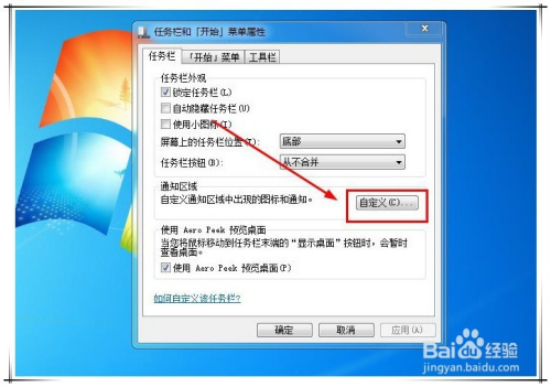 第三步,在打开的使命栏页面中,点击通知区域中的“自界说”按钮。