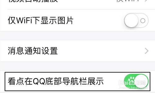 点击今后在设置页面的底部可以看到“看点在QQ底部导航栏展示”,并且系统默认的这一项是开着的,我们只需将右侧的开关关失落,再次返回到QQ本家儿面板会发现看点从底部消逝了;