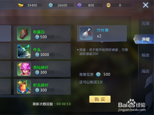 然后可以利用获得的声望采办竹叶青等道具或者是祖师碎片。
