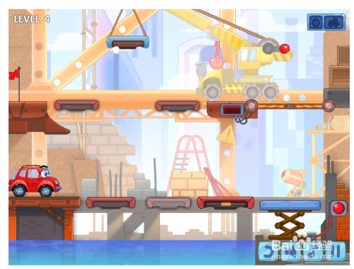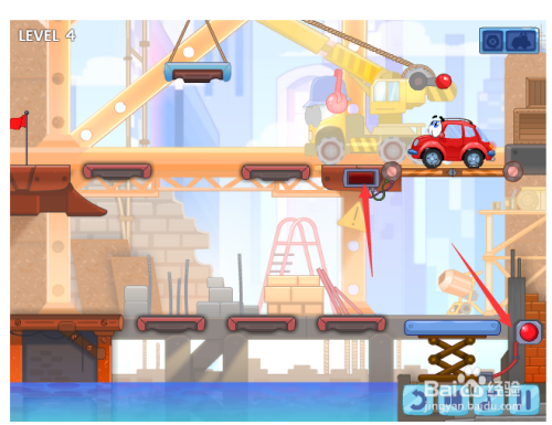 然后,点击小汽车,小汽车起头行驶进步,你要快速点击第1个浮桥,然后第2个浮桥、第3个浮桥,小汽车到跳板时,要点开跳板按钮,即可再快速点跳板上面的长方小块开关,封闭吊板,让小汽车落在上边。